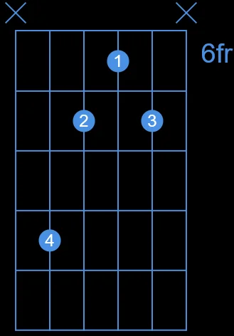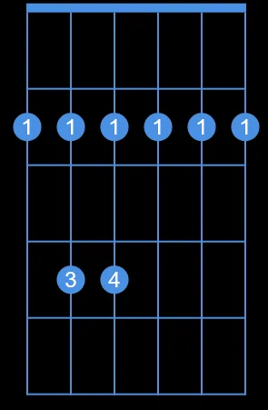 Commençons par la forme la plus couramment utilisée par les guitaristes (mais pas la plus facile). Si vous êtes débutant(e) il pourrait vous poser quelques difficulté puisque c’est un accord barré sur les 6 cordes.