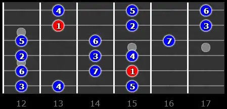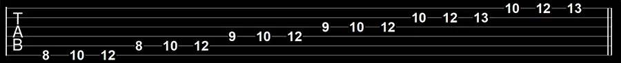 Comme vous pouvez le constater c’est assez difficile à mémoriser présenté sous cette forme. C’est pourquoi on a tendance à découper les gammes en plusieurs positions pour faciliter les choses.