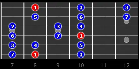 La gamme majeure contient 7 notes différentes on va donc la décliner en 7 positions différentes.