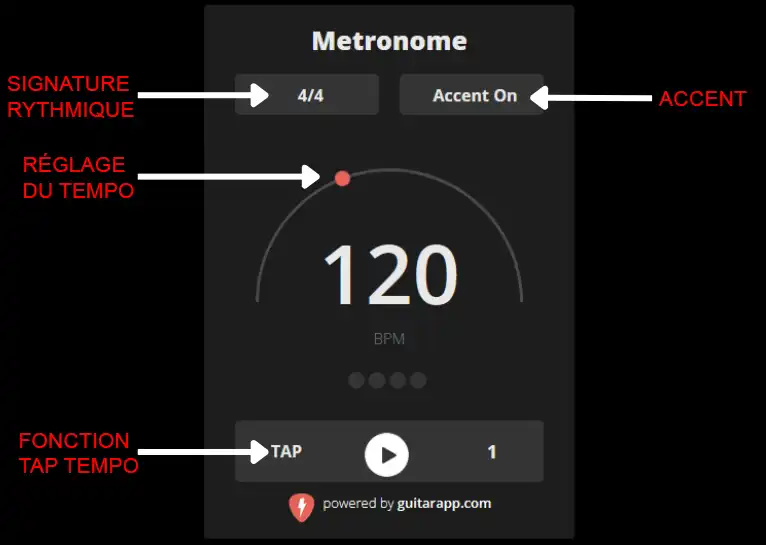 Cette fonction vous permet de régler la signature rythmique qui détermine la durée de chaque mesure. Elle est configurée en 4/4 par défaut mais ce métronome en ligne propose beaucoup d’autres signatures. Pour en savoir plus sur les signatures rythmiques vous pouvez consulter cette page sur le rythme.
